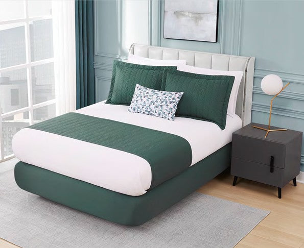 Gradient quilted scarves and shams bring natural vibes, with leaf tones and a unique botanical palm motif. The scarves, crafted from 85 GSM Pongee microfiber fabric and filled with 100 GSM of recycled polyester, showcase a sustainable design with 33% recycled fiber and 100% recycled fill. Each scarf features meticulously single-needle stitched 1” hems with mitered corners, providing a refined finish. The knife-edge shams are designed with a 2” self-flange and a generous 4” back overlap, ensuring both style and functionality. Soft and easy to care for, these scarves combine comfort and durability while ensuring vibrant colors last.